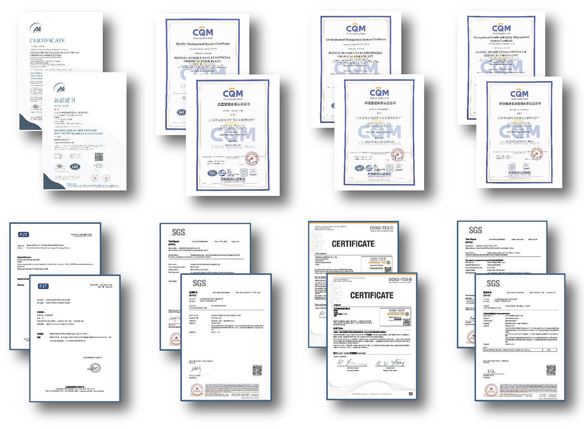 Huaxicun fiber has passed the test of OEKO-TEX standard 100 and updates test reportregularly from reliable third-party organizations such as SGs, Intertek, and ChineseInspection Bureau etc.Huaxicun fiber can also meet the requirement of regulations such asREACH and FDA.